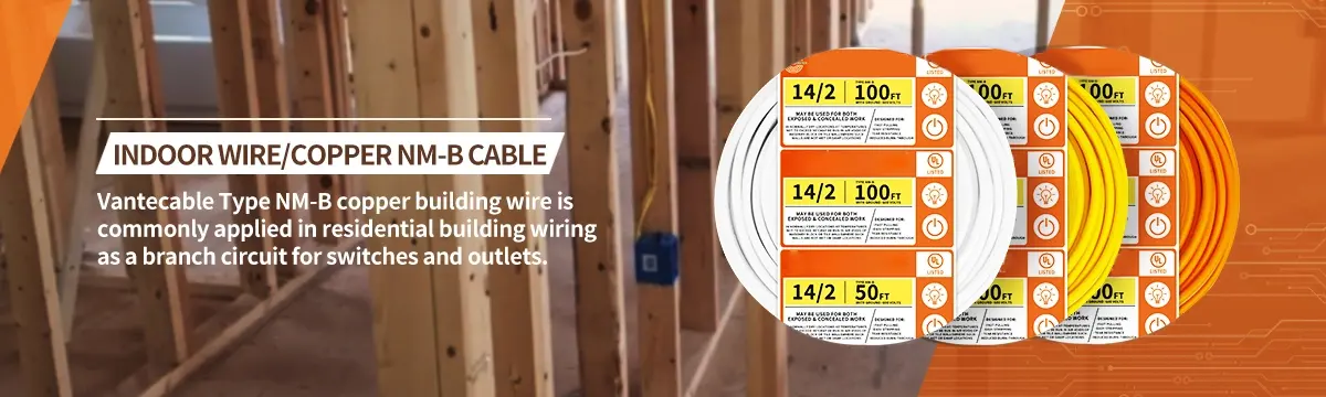 ·Wire Application: Vantecable Type NM-B (non-metallic 90° C) Copper Building Wire is commonly applied in residential building wiring as a branch circuit for switches and outlets and indoor applications inside wall cavities and attics