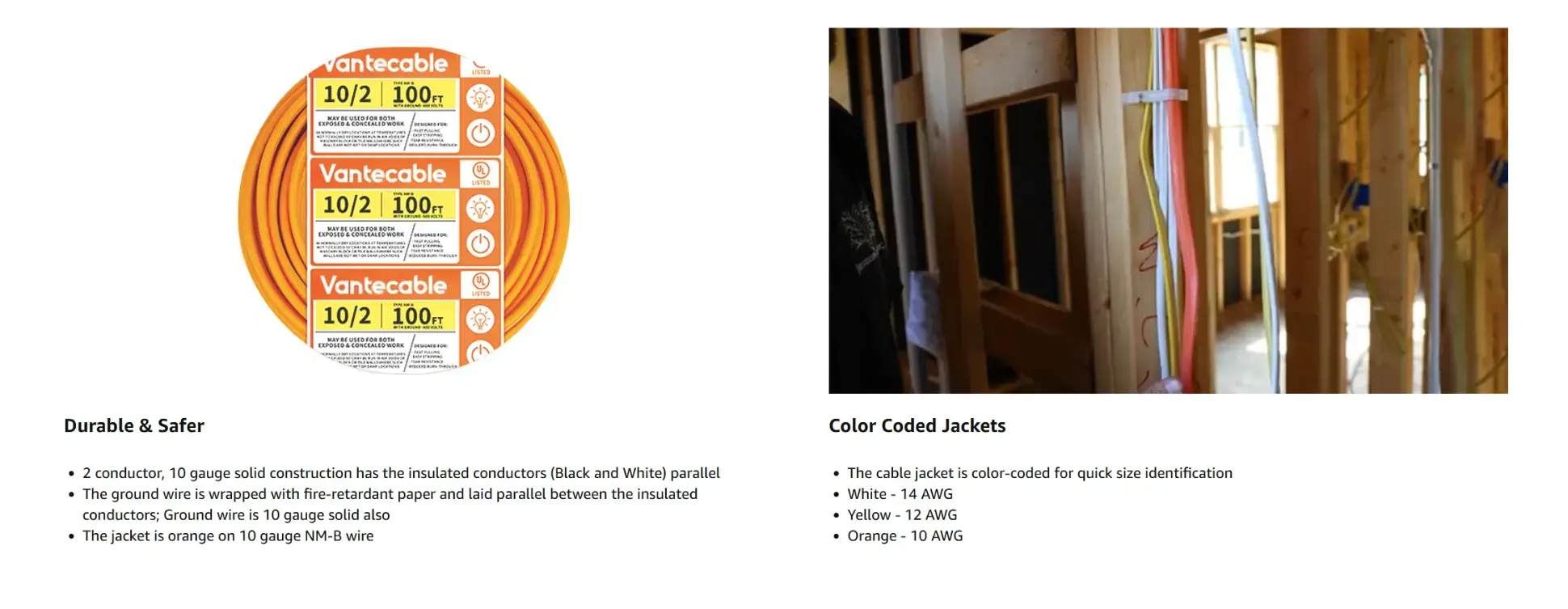 ·Durable & Safer: 2 conductor, 10 gauge solid construction has the insulated conductors (Black and White) parallel; The ground wire is wrapped with fire-retardant paper and laid parallel between the insulated conductors; Ground wire is 10 gauge solid also; The jacket is orange on 10 gauge NM-B wire