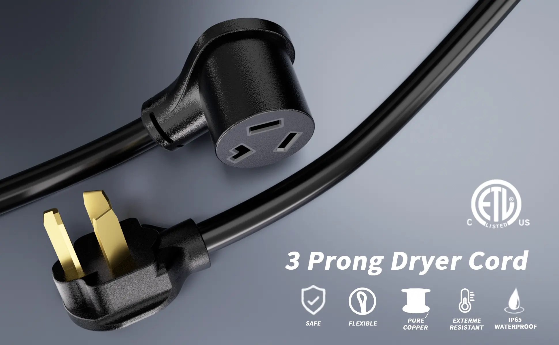 ·Electrical Rating: NEMA 10-30P male plug and NEMA 10-30R female receptacle, 10 gauge 25 foot dryer cord 3 prong rated to 125/250V, 3750/7500W, ETL Listed, providing a reliable power connection of sufficient length for your dryer, regardless of placement location.