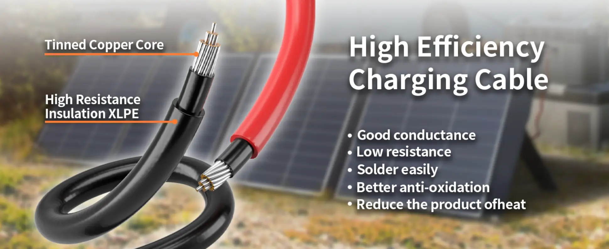 ·Tinned Coppoer Wire: Made with tin-coated pure cooper, the tinned-coated pure cooper cable has good electrical conductivity, compared with bare copper wire, its corrosion resistance and oxidation performance are stronger, also can greatly extend the service life of cables; Using a 10AWG solar extension cable can minimize power loss in your solar panel system.