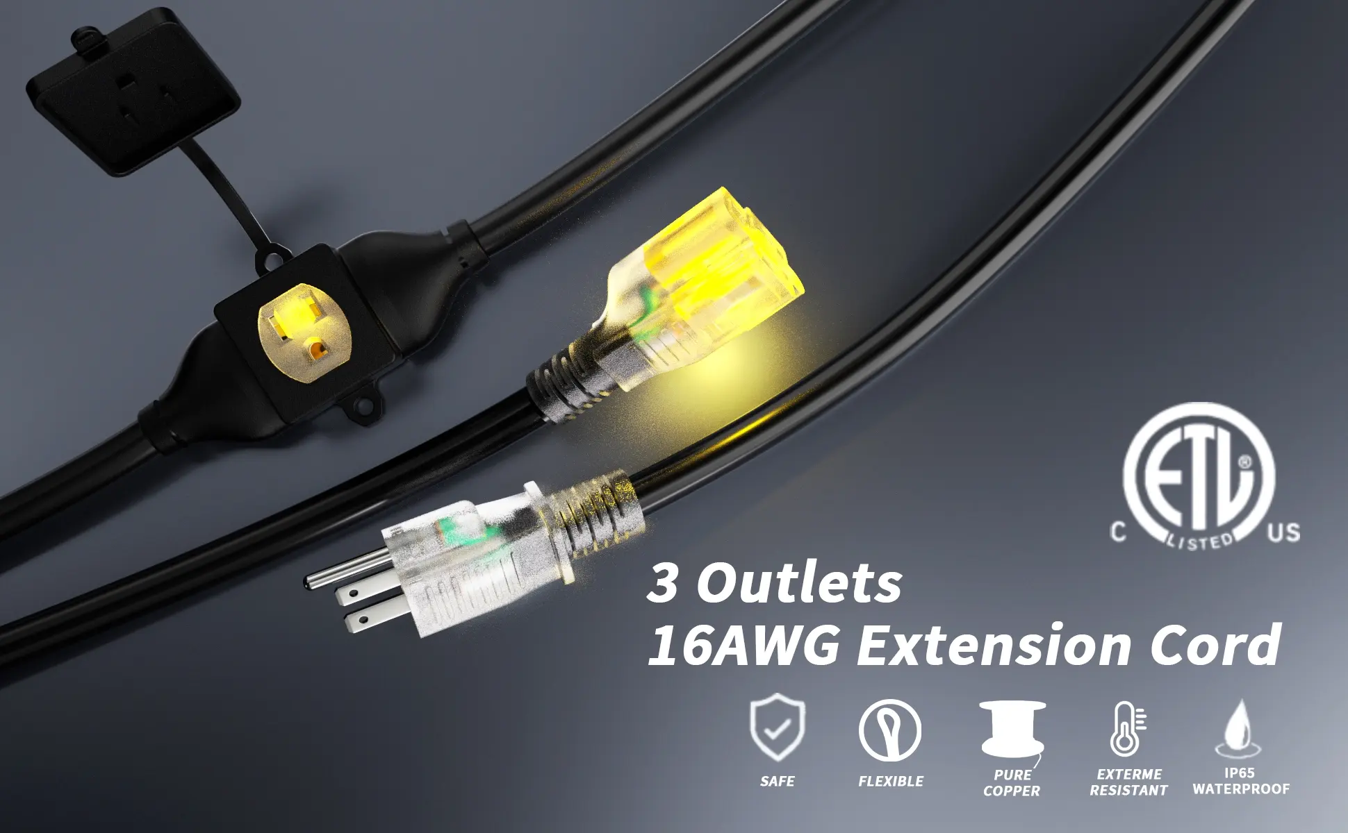 ·16/3 Heavy-Duty Build: Constructed with three 16 AWG pure copper conductors to support up to 1625W. Provides reliable, steady power for seasonal decor, garden tools, and shop equipment.