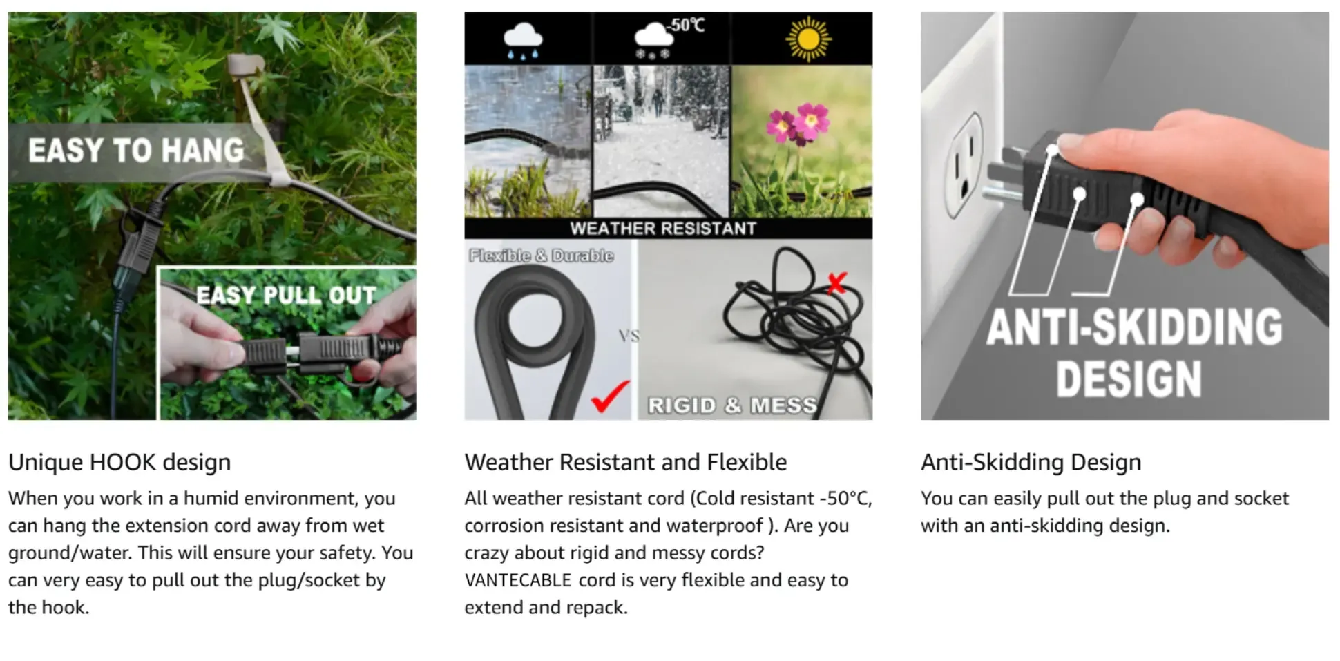 ·Durable & Safer: The plug and socket end has a long durable strain relief design; which passes 20000 times great angle bending without break, extending the service life; Each Power Extension Cord passes the 2500V high Voltage test before shipment keep safety in mind.