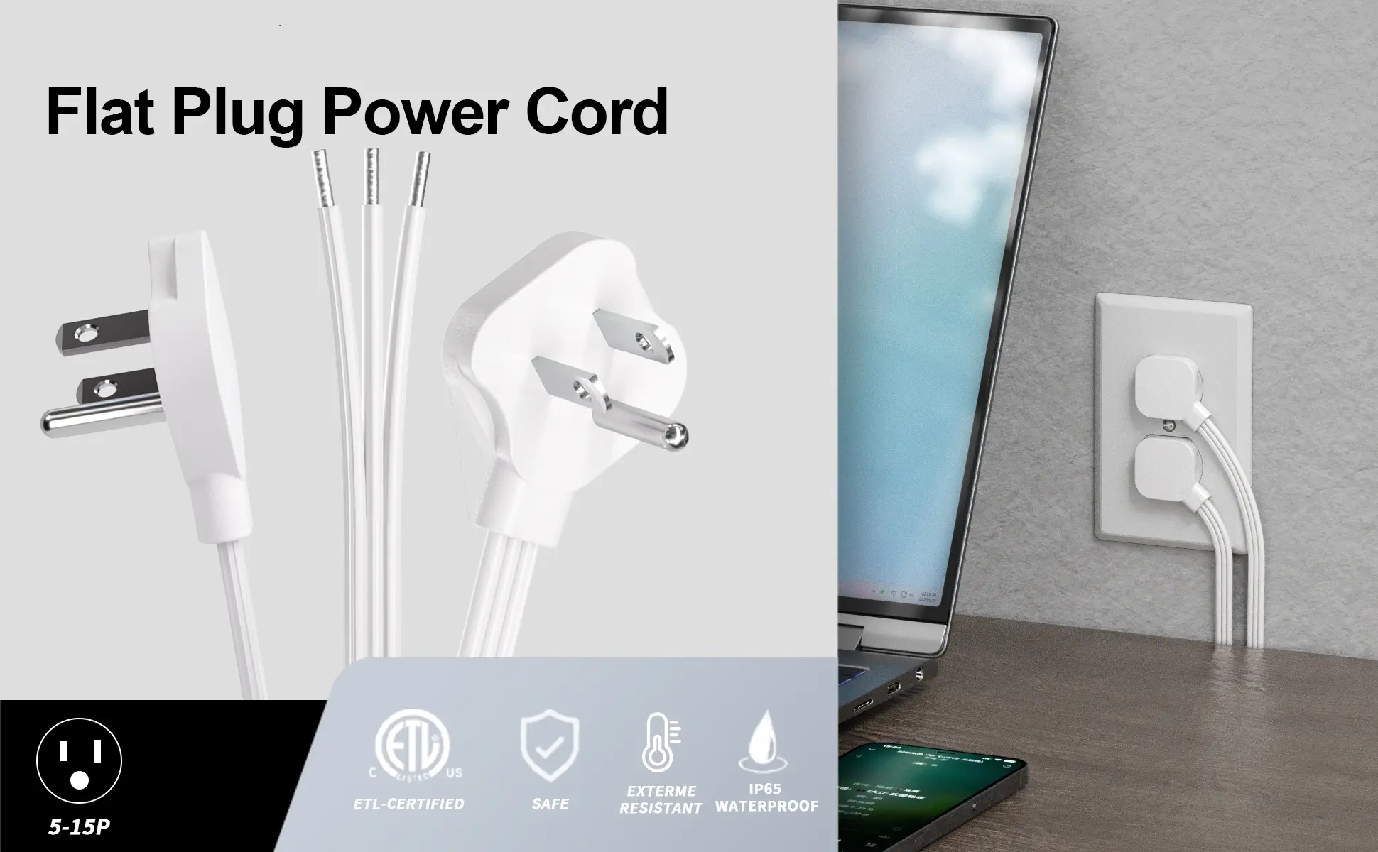 ·Heavy Duty & Safe: 18/3 extension cord 3 prong plug replacement 5 feet; 10Amp 125Volt 1250 Watts, SJTW, ETL Listed; and has less chance of getting hot; the wire temperature rise is qualified to ensure safety; White extension cord 5ft suitable for indoor and outdoor; home office use