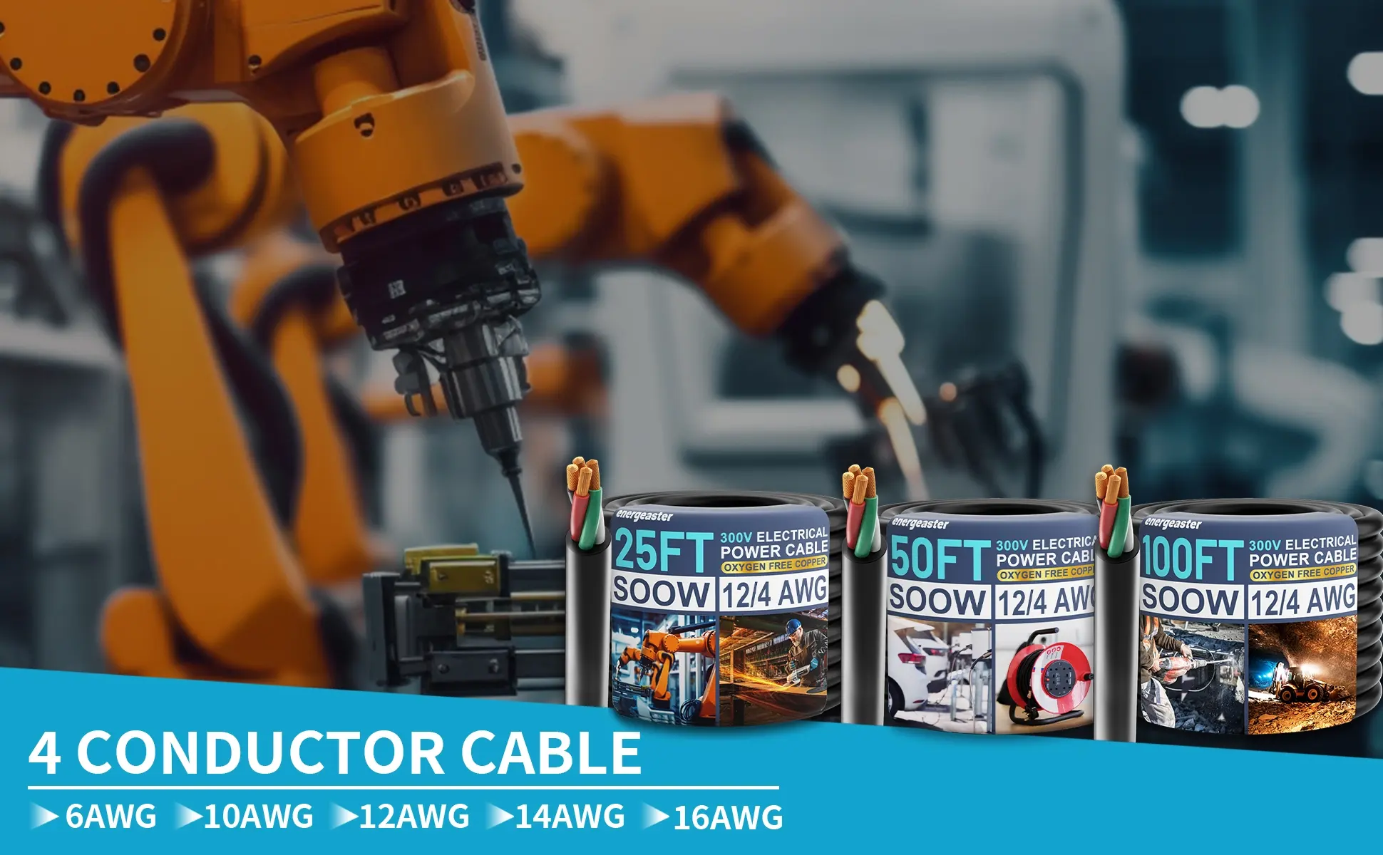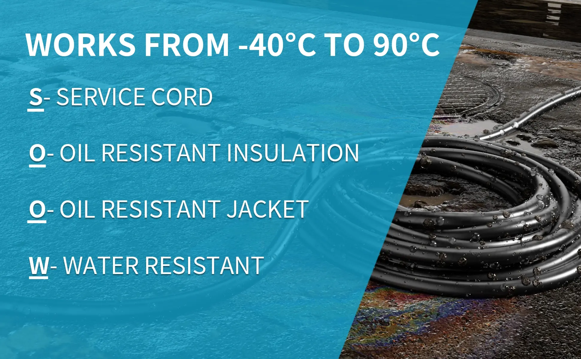 ·Robust Electrical Cable: Heavy Duty 12 AWG 600V SOOW (Service, Oil, and Water Resistant) cable is a type of electrical wire that is commonly used in industrial; commercial, and outdoor applications; It is insulated; and is covered by a durable rubber jacket that provides resistance to oils, acids, water, and chemicals ; making it a durable and long-lasting option for harsh environments (-40C to 90 Celcius)