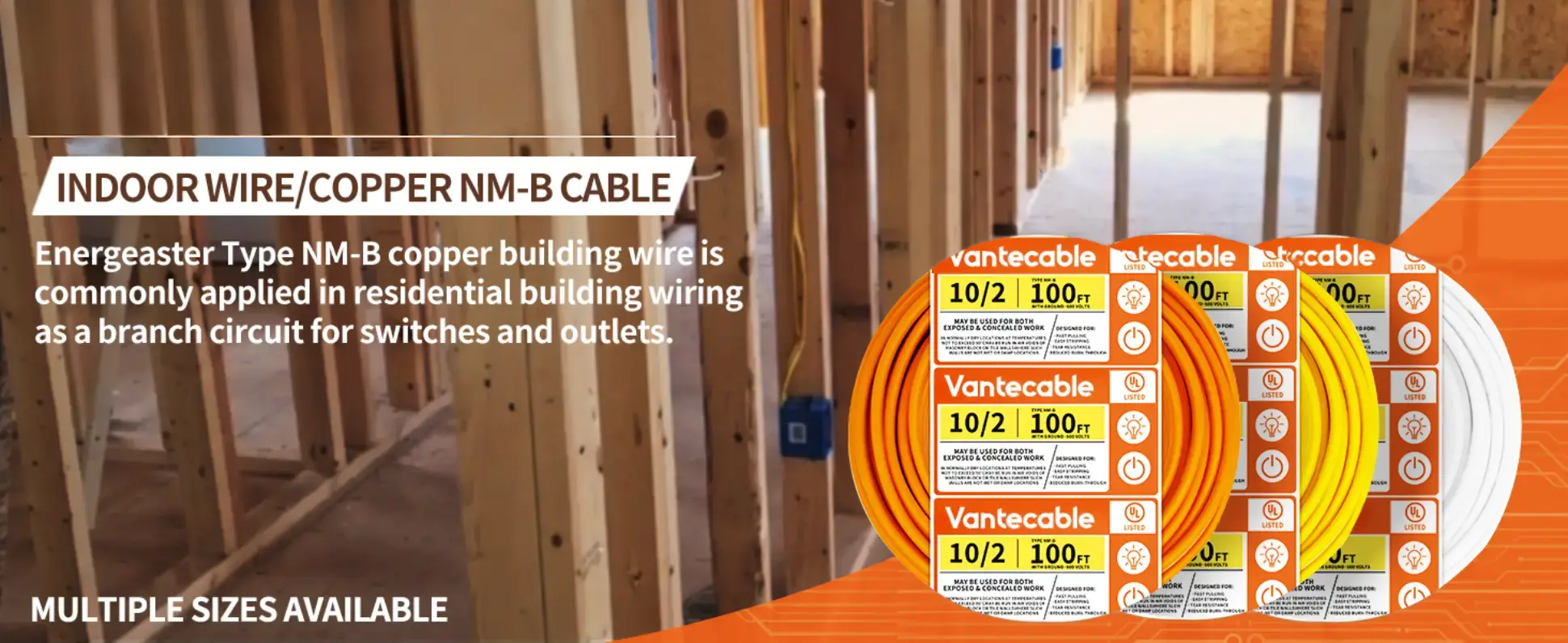·Wire Application: Vantecable Type NM-B (non-metallic 90° C) Copper Building Wire is commonly applied in residential building wiring as a branch circuit for switches and outlets and indoor applications inside wall cavities and attics